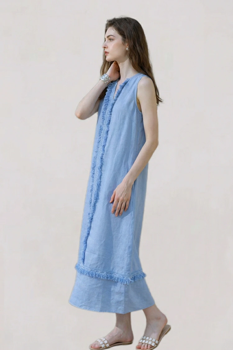 To meet the core demands of summer wholesale purchases, the Stylish Women's Linen Maxi Dress adopts a loose-fit design, balancing comfort and inclusiveness. It can suit various body types, whether slim or slightly plump, and can be easily worn by everyone. This significantly expands the target audience for sales and increases the return on investment for purchases. The sleeveless V-neck design is refreshing and neat, suitable for hot summer weather. At the same time, the V-neck can skillfully modify the shoulder and neck lines, elongating the neck proportion and highlighting the feminine charm of women. The long dress design has a good draping effect, naturally falling from the shoulders, effectively covering excess fat on the waist, hips, and legs, minimizing the shortcomings of the figure. When walking, it has a graceful and elegant feeling, with a strong atmosphere. This long dress is suitable for various summer scenarios. It can be worn alone to create a French casual style, suitable for city walks, weekend dates, or as beach vacation wear, suitable for the seaside leisure atmosphere, and adaptable to various scenarios.