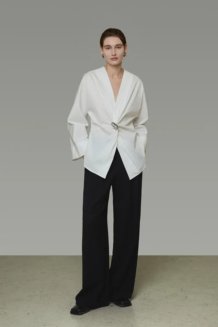 The Women's Metal Buckle Party Blouse features an asymmetrical waist knot combined with three-dimensional metal buttons for decoration. The visual focus is prominent, naturally cinching the waistline and highlighting the curves. It also uses pleats to soften the figure, offering a high degree of flexibility for various body types. The crossed V-neck is neat and elegant, with a crisp and smooth fabric that is lightweight and does not collapse. It combines the practicality of a shirt for daily wear with the fashion appeal of a party top, allowing for versatile wear and strong visual recognition.