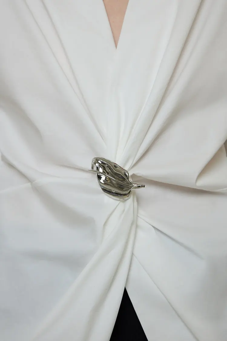 The Women's Metal Buckle Party Blouse is made of a blend of 53.1% polyester fiber, 41.2% cotton, and 5.7% spandex. It has a smooth texture and excellent drape, combining the breathability of cotton with the elasticity of spandex. It feels comfortable against the skin, doesn't cause excessive sweating, has good heat dissipation, and is suitable for long-term wearing in spring and summer. The fabric is wrinkle-resistant, doesn't deform easily, and doesn't shed fibers. It's simple to care for and can remain neat and stylish even after prolonged sitting, significantly reducing the after-sales pressure for wholesale customers.