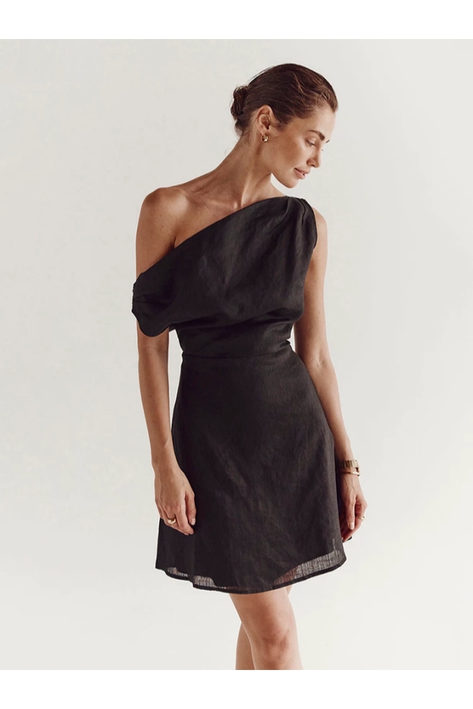 Clean, precise stitching highlights the linen’s natural texture, while a minimalist construction avoids excess embellishments, letting the fabric’s organic beauty take center stage. The dress’s subtle asymmetrical hem adds gentle movement, creating a graceful sway with every step. Available in classic black and versatile neutral tones, it serves as a blank canvas for styling—easily paired with accessories to suit personal taste. The design balances architectural precision with fluid comfort, embodying the effortless chic that defines modern women’s fashion.