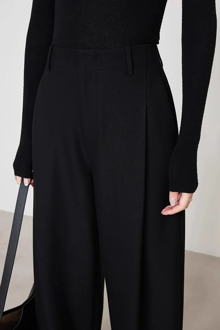 The Women's Pleated Suit Pants feature a scientifically diverse fabric composition, specifically 65% polyester + 20% viscose + 6% wool + 6% lyocell + 3% spandex. This combination gives the pants multiple advantages, ensuring both texture and comfort levels are top-notch. The fabric has a smooth and crisp texture, exuding a neat quality, which perfectly suits the professional attributes of suit pants. It also has excellent elasticity, providing a comfortable feeling without any constriction, allowing for all-day wear comfort and meeting the needs of long commutes in the workplace. We can adjust the fabric components flexibly according to the brand positioning and specific requirements of the buyers, precisely adapting to the aesthetic and wearing needs of different markets, breaking the homogeneity and helping the buyers create exclusive competitive advantages, further enhancing the market acceptance of the products.