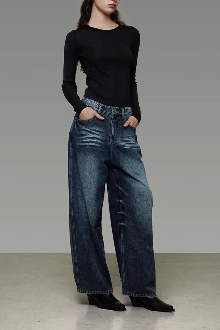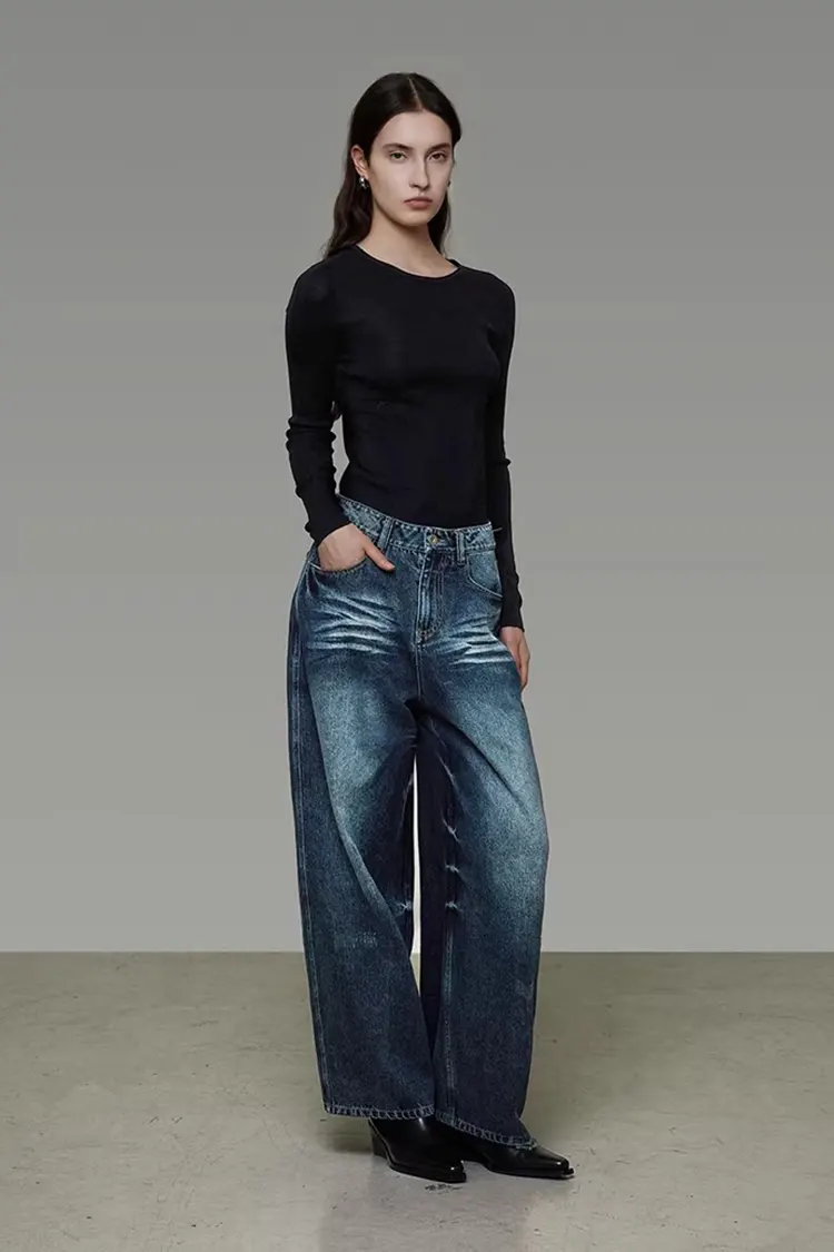 Women's Washed Denim Wide-Leg Pants support full customization of color, size, and logo. They can be adjusted according to the brand positioning and target market of the customers. The minimum order quantity is 300 pieces, and the delivery cycle is 30-45 days. They can be shipped from Shanghai and major domestic ports, with flexible options for logistics methods such as sea freight and express delivery. The entire process from consultation, sample making, production to shipment is provided with one-on-one service. The sample fee can be refunded after placing the order.